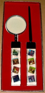 Capitol Records 25th anniversary promo-only magnifying glass & letter opener set from 1967. It came in a gold cardboard box. Pet Sounds was, apparently, not considered worthy of proper promotion, but it could be depicted on desk set items. |