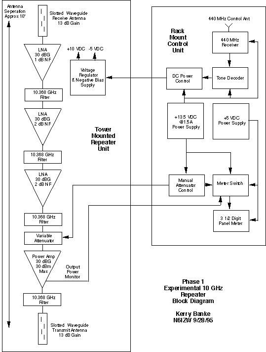 This repeater is very simple in concept. It was found through experimentation that two of the slotted wave guide type omni-directional antennas at 10 GHz have an isolation of about 90 dB when vertically separated by about ten feet. A series of amplifiers and filters are placed between the two antennas with the gain set at some level (say 10 dB) below the point of oscillation. This repeater then receives, amplifies, and retransmits any signals within the bandpass of the filters regardless of modulation type. This means that with a 10 MHz bandpass, the repeater can pass a large number of simultaneous users at slightly different frequencies or a few users if the signals are very wide band such as fast scan ATV or very high speed packet.