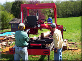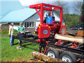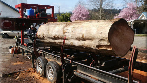 A large cedar log on the Mighty-Mite band saw mill.
