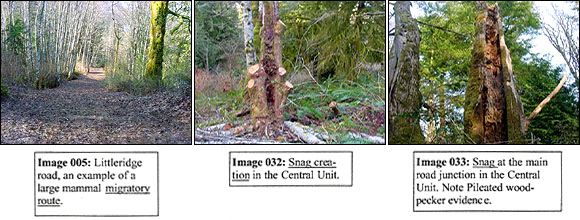 There is prolific evidence of woodpeckers and woodpecker-associated species. These include the Brown creeper (Certhia americana), the Red-breasted nuthatch (Sitta canadensis), the Pileated woodpecker (Dryocorpus pileatus), the Hairy woodpecker (Picoides villosus), and the Red-breasted sapsucker. The Pileated woodpecker is present in large numbers, as evidenced by the multiple borings in snags throughout the property. The Dark-eyed junco (Junco hyemalis) and the Spotted towhee (Pipilo maculatus) are also likely residents (Appendix I, Various Images).