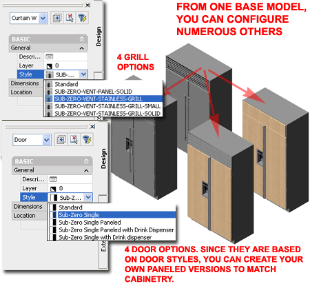 Illustrated to the right I show an example of how we used ADT's native Curtain Wall Style to create a parametric refrigerator based on a popular manufacturer's on-line specifications. Because the example model offers options for grills and doors along with variable grill heights, we designed solutions that match those manufacturer options. You can start with the basic model and change options as you see fit using the Properties Palette. |