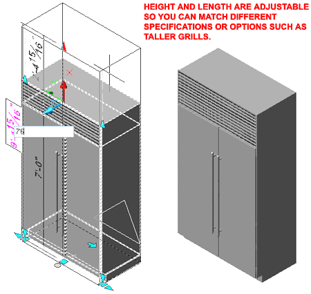 One Size Fits All Illustrated to the right I show how you can use the Height Grip to adjust the Grill Panel to match specifications set by the manufacturer. Because this manufacturer based many of their model offerings on the same general frame, one Style can actually be adapted to produce a whole suite. In the coming months we will issue more refrigerators from the same manufacturer culminating in the complete lineup of their models. Subscribe now to begin using the model shown here. To learn more about our Kitchen Cabinets eKit, read this >>> |