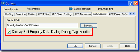 Illustrated to the right is the Options ( type "OP" ) dialog box with the AEC Content tab active. Content Path - this is where you can set your ADT to see a common folder on an office's network server. By keeping all of the Content in one place, it's growth and change can be managed much better ( just like a block library ). Once changed, the icons will automatically look for this Path. |