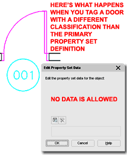 CLASSIFICATIONS: As an example, you might think of a set of Doors that have been Classified as "New", "Existing" or "To Be Demolished". By using the Classification Filter for only one of those categories, a user will not be able to Apply or Attach this Property Set Definition to Doors that are not Classified to match the selected (checked) Filter. This appears like a fantastic feature and in essence it is but I found that despite the filter, Door and Windows can still be Tagged; the Property Set Definition cannot be Attached but the Tag will still hook on to the Door. I would, of course, prefer that you could not Tag the Door but then this would prevent simultaneous Schedules: one for New Doors and one for Doors to be Demolished, for example. If you are interested in exploring this further, make sure to look into using this Classification system on your Schedules as well because I have found that option often produces more of what I want than using the filter here. In other words, I don't use the Classifications Filter as illustrated to the above, I only show it to demonstrate how it could be used. |