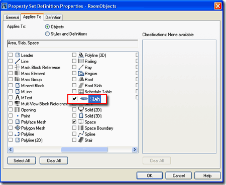 If you tend to use Slab Objects for floors, you may want to tag them with Room or Room Finish Tags but you may find that you can't since these Tags, by default, only apply to Space and Area Objects. Illustrated to the right is a simple step that you can take to change these Tags so they will work on Slab Objects. By using the PropertySetDefine command you can access styles like "RoomObjects" and "RoomFinish" and change their Applies To setting as illustrated to the right. Once you have changed the Applies To setting to apply to Slab Objects, you will find that the Tag will now react to Slab Objects and function much like it does for Space and Area Objects. |