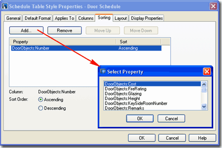 | Style Properties - Sorting tab On the Sorting tab of the Schedule Table Style Properties dialog box, you can control the sorting order of the information in your Schedule Table based upon one or more Property Values.