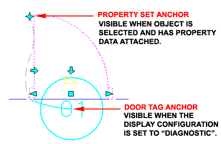 Illustrated to the right I show to interesting Anchor related Graphics that currently don't do much but may in the future. In the template files that come with ADT, you should find that there is a Display Configuration called "Diagnostic" and when this is set active, you should see arcs between Tags and their target Objects. This allows you to see which Tags are Anchored to which Objects but Tags still do not Move with Objects as they should. Once an Object has Property Data Attached to it, as the Door in the illustration to the right, you should find that there is a Property Data Location Anchor when the Door Object is Selected. At the time of this writing I have no explanation for what you can do with this Anchor but I suspect we will all know what we can do with it in a future release of ADT. |