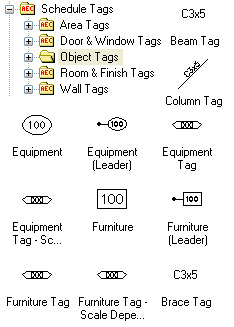 Illustrated to the right, I show a few common simple object types and their matching tag objects. If you want Numbers in your object tags, you have to make sure that your objects have a Property Set Definition Style Added to them. You can read about Adding Property Set Definitions below. To add or edit information on Object tags, see -> Edit Schedule Data dialog box |