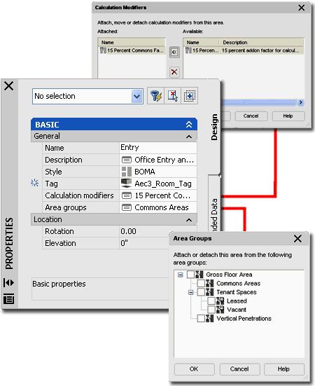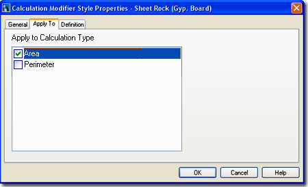 | Style Properties - Apply To tab On the Apply To tab of the Area Calculation Modifier Style Properties dialog box, you can specify whether you want the modifier applied to the Area and/or the Perimeter calculation. If you have no idea what to do here, skip this and move on to the Definition tab and then come back. The Building Owners and Managers Association, International (BOMA) http://www.boma.org/ publishes numerous formulas and standards for how to calculate Areas. Below is a basic list of some of these area types. By using a building standard formula and applying it to the Area and/or Perimeter, you should be able to reduce some of the time spent on manually calculating your areas.