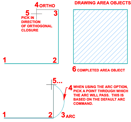 Area Example Adding or drawing Area Objects is similar to drawing Polyline shapes. In fact, one way to create more complex Area Object shapes is to start with Polylines and then Convert it to an Area Object. Illustrated to the right I show a couple of the options you can use when drawing the edges of an Area Object. These options are listed on the command line and can be set by typing the capitol letter; such as "O" for "Ortho". The "Ortho" option automatically draws the last two edges of the current Area Object in such as way that the last edge will always be orthogonal (90 degrees) to the first edge. The "Arc" option provides the option to create curves for edges but because the arc type offers no option on how to control the arc, I find this option too difficult to use to be practical. As illustrated to the right, you must specify a point through which the Arc passes and then the final point of the Arc. You can, of course, refine the Arc later using Grips but then you can also introduce an Arc with one of the Grip options. |