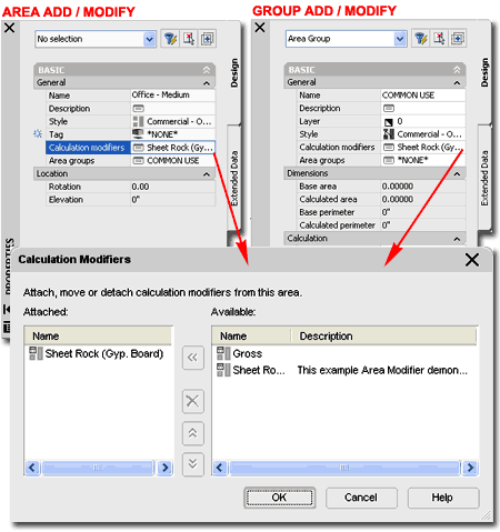 Templates Once you have created an Area Calculation Modifier Style, it becomes another mystery to figure out how to use it. There are two primary places that you can Attach an Area Calculation Modifier as part of the Creation process and one primary place that you Attach an Area Calculation Modifier as part of a Style ( Area Group Template ). 1) When Adding or Modifying Area Objects, you can use the "Calculation modifiers" field to access the Calculation Modifiers dialog where you can Attach one or more modifiers - as illustrated to the right. This only affects the current Area Object. 2) When Adding or Modifying Area Group Objects, you can use the "Calculation modifiers" field to access the dialog where you can Attach one or more modifiers - as illustrated to the right. This affects all Area Objects that are Attached to the current Area Group. Be aware that Calculation Modifiers are accumulative and thus whatever you Attach to an individual Area Object will also reflect on anything you Attach to the parent Area Group; i.e., if you work with Area Groups it is probably best that you only apply Calculation Modifiers at the Group Level. 3) By using Area Group Template Styles (not illustrated), you can pre-Attach your Area Calculation Modifier Style to an Area Group. Any Area Group based on this Template Style will then take on the Area Calculation Modifier Style and any Area object associated with this Area Group will thus, in turn, take on the Area Calculation Modifier Style - as long as the calculation report is based upon the Area Group(s). This option is more efficient but can also be confusing. Which method to use really has to do with your personal grasp of the whole process and the size of your project. A simple residential project is probably ideal for the first method but large commercial projects will most likely need to be managed through the Area Group Template Style method. |