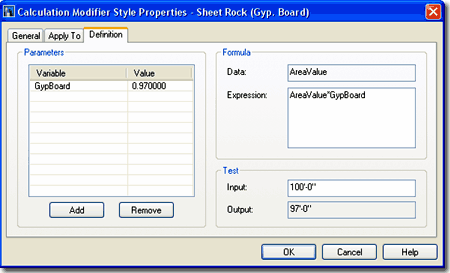 | Style Properties - Definition tab On the Definition tab of the Area Calculation Modifier Style Properties dialog box, you can Add a Variable name and Value to be used for Area or Perimeter Calculations. Parameters Formula Expression - use this text area to write your mathematical statement. The statement can relate directly to your Variable or you can simply write an equation without using any Parameters. In other words, you can have an Output equation that reads something like "AreaValue*GypBoard" or you can ignore the process of writing the GypBoard Parameter and simply write "AreaValue*.97". Test Output - a non-editable field that runs an Output test result based upon your typed Test Input value. |