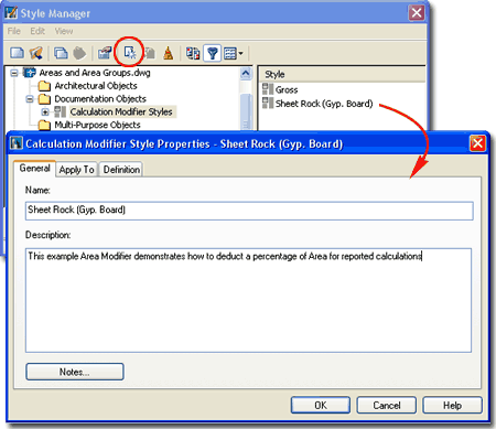 Area Calculation Modifier Styles sound a lot more complicated than they really are and given that there is so little to them at present, they could have been dealt with in a much simpler fashion. I think things like this are probably easier to deal with within the whole Report output process but since I don't get to make decisions about how ADT is written, let's just look at what they have here. Illustrated to the right, I show the Style Manager Window activated and filtered for Area Calculation Modifier Styles. I also show that I have created a new Area Calculation Modifier Style that I called "Sheet Rock (Gyp. Board)". This Style will be used to store some Area Calculation variables that we will learn how to apply or Attach to Areas and Area Groups and then how to use in Excel Spread Sheet Reports. |