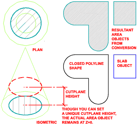 Much like the Convert option for many other ADT Objects, you can use the AreaConvert tool to capture the shape of numerous closed 2D and 3D Objects; from basic Circles to Roof Slabs. When you Select an Object to Convert to an Area you will not be queried about what to do with the current object so it will always remain but you will be queried about the "Cutplane Height" and that offers some interesting possibilities for cutting Areas at different heights on 3D objects that taper in the Z-axis - see illustration of Cone, right. Command Line: |