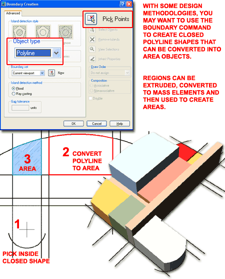 Boundary Command At times you may find that the process of converting your schematic work into Area Objects is problematic. In cases like this, I often look for basic AutoCAD tools to help the process and in the illustration to the right I show how the Boundary command ( type "BO") can be rather beneficial at times. When you use the Boundary command, the Advanced tab of the Hatch dialog appears and provides you with a few options. The most important option to focus on is the "Object Type" which can either be set to "Polyline" or "Region". Architectural Desktop cannot convert Regions to Areas so be sure to avoid this option if at all possible. By using the Pick Points button, you can capture closed shapes that can then be converted directly to Area Objects with the AreaConvert command. If you happen to end up with Regions or prefer to work with Massing Models as part of your early schematic design phase, you can use the Extrude command to make 3-dimensional volumes out of Regions. Regions that have been Extruded become Solids and Solids can be converted directly to Mass Elements with the MassElementConvert command ( or Context menu option ). You can create Area Objects from Mass Elements by using the same AreaConvert command use to derive them from Polylines. Pay attention to the Cutplane Height option when you perform this task; I typically use a CutPlane of zero. |