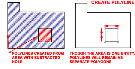 Creating Polylines from Area objects produces polygons on top of the Area objects. If an Area object has subtracted holes in it, the hole will produce a separate Polyline polygon, as illustrated to the right. Area Groups also have this tool and you may find the results more valuable if you are roughing out preliminary design concepts. The reason I suggest using the Area Groups is that you can create Polyline perimeters based on Groups of Areas as opposed to doing it by individual Area objects. |