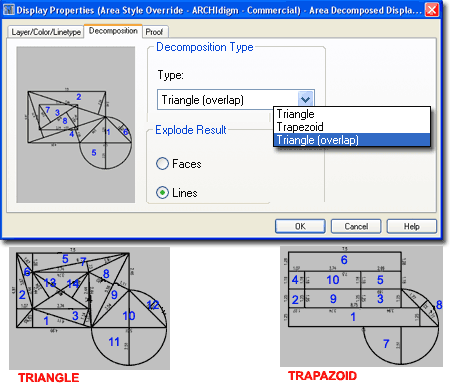 - Decomposition Types On the Decomposition tab of the Display Properties dialog, you can choose between three types of decomposition formulas and set these polygons to Faces or Lines. DECOMPOSITION TYPE EXPLODE RESULTS |