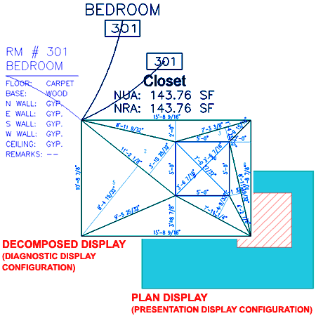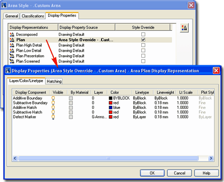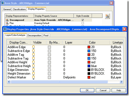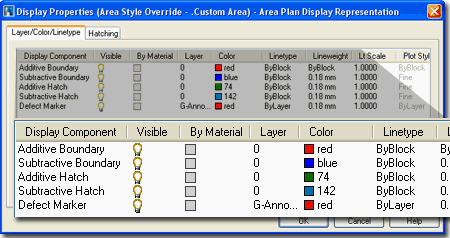 Illustrated to the right I show the Layer/ Color/ Linetype tab of the Decomposition Display Properties dialog and illustrated below right, I show what each Display Component looks like in an example Area Object. |