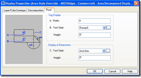 - Proof Annotation On the Proof tab of the Display Properties dialog, you can set the Text Style ( Font ), Text Height and a Prefix for the decomposition regions. TAG DISPLAY B - Text Style - use this drop-down list to select any predefined text styles currently available in the drawing file or use the (...) ellipses button to activate the Text Style dialog and create a new Text Style. The Text Style height, as set on the Text Style dialog box does not affect the height which is set here. Height - use this value field to specify the actual height you want for your Area decomposition region Tags. |