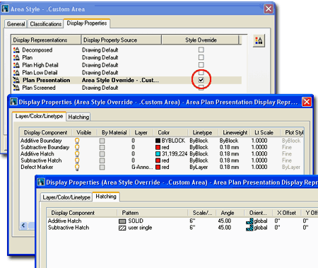 | Areas in Plan Part of working with Area Objects involves presenting them on drawings to non-architectural laymen such as clients, accountants and so forth where clarity of what these objects represent becomes crucial to supporting your study. In cases like this, you will most likely want to use a variety of Area Styles that each have their own Plan Presentation Display Characteristics so Corridors, for example, are Hatched differently than Offices. Without taking Area Groups into account, there are two primary methods for creating Area Objects with Display Representations that differ under something like the default "Plan Presentation" display representation. One method is to use Display Overrides on one common Area Object Style and the other method is to use Display Overrides on Area Object Styles (use one Style for each type of Area or Area Display) As with other Display Overrides discussed in this guide, I continue to caution against applying them at the Object level because of how difficult it can be to make more global changes later on in a project. Illustrated to the right I show how you can use a "Style Override" on the Display Properties for a single Area Style. By using this technique and having unique Area Styles for each type of Area you want to display differently, you are likely to have much better display control during the course of your project. |