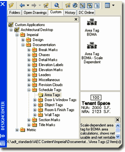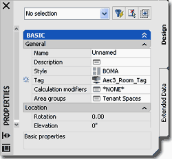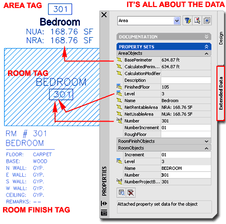 Illustrated to the right I show what the default "Area Tag BOMA" appears like but also how two of the Room & Finish Tags appear when used on Area Objects. When you tag an Area Object, the tag automatically engages with the object and attaches Property Data to it. This data can be read off of the Extended Data tab on the Properties Palette for an Area Object once it has been tagged. Since I have tagged my Area Object with three different tag types, you can see that I have three Property Data sections: AreaObjects, RoomFinishObjects and RoomObjects. The crucial aspect of this data that you must understand is that some of it is automatically extracted from the Area Object and some of it must be input by you. In addition to this, some information, such as Level, comes directly from the Project Management System and if you don't use this tool this information will be listed as "*No project*" ( that's okay but now you know why that is being reported there ). |