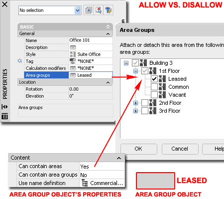 Under the General section of the Area Properties Palette, you can use the Area Groups dialog to Attach, Detach and monitor the current layout of your Area Group organization. The option to Attach or Detach Area Objects within the Area Group dialog is affected by the "Can Contain Areas" toggle under the Content section of the Properties Palette for Area Groups - see illustration below right. Unfortunately, unlike the case with Area Groups, there are no distinctive graphic makers on the Area Groups to let you know if you can Attach and Area or not. To confirm that you successfully Attached an Area to an Area Group, be sure to monitor the results on the Area Groups field when you exit the Area Groups dialog. Note: |
