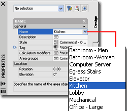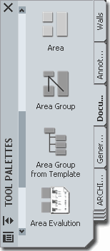 The Add Area Properties Palette offers a few options that should be fairly easy to understand. Some options, like the Name and Area Groups fields, will only offer a drop-down list if the current drawing has corresponding Styles. The Styles that play a role in higher level use of Area Objects requires a broad knowledge of Area Objects and Area Group Objects so don't let these subjects deter you from jumping in and learning as you go. GENERAL Style - an Area Style can be created with the Style Manager to help distinguish areas by such display features as hatching and color coding. Area Styles only offer Display options. Tag - to use the Tag option, you must have a tag object already loaded in your drawing. Once one exists in your drawing, you can have it automatically assigned to your Area objects upon creation. You can always add a Tag later as well. Though Room tags work for Area Objects, you may want to use the predefined Area Tags from the Area Tags folder in the DesignCenter. You can read more about Areas and Tags below and in Part 18 - Schedules. Calculation Modifiers - this option can be used to assign any Area Calculation Modifier Style that is available in the current drawing. These simple formula based styles can be used to modify the results of Area Calculations to conform to such standards as those set by BOMA or for other office criteria. See Part 20 - Areas, Area Calculation Modifier Styles for more on this subject. Caution: Area Calculation Modifier Styles can be assigned to both Areas and Area Groups and thus be accumulative. Area Groups - use this dialog to see all Area Groups in the current drawing. Put a Check mark next to any that you want the Area Object you are creating to be associated with. Command Line Match - use this typed option to inherit any or all of the following settings: [Style/Name/Group/Modifier]. |