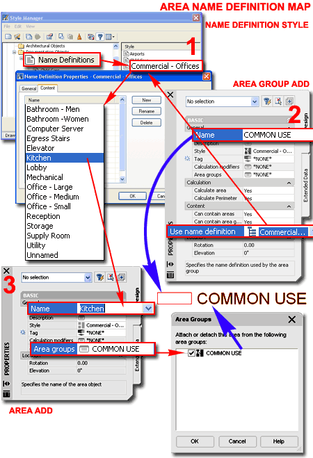 In the illustration to the right I show the shortest path to using Area Name Definitions when Adding Area Objects. Before you attempt to comprehend the whole thing, notice that the common thread between the three dialog boxes is the graphic rectangle labeled "COMMON USE". This rectangle is actually an object called an Area Group that acts as an organizational tool to help manage, display and perform calculations from Area Objects. You don't actually need to understand how the Area Group works to use the Area Name Definitions but you should explore the whole subject when you can. 1. Use the Area Name Definition Style dialog box to create a New Area Name Definition. In the illustration to the right I have one labeled "Commercial - Offices". For this Area Name Definition Style, use the Content tab to create a list of New Names that will be used for your Area Objects. OK out when done. Task one is complete. 2. Use the Add Area Group tool to access the Add Area Group Properties Palette and create an Area Group Name. In the illustration to the right I show a Name as "COMMON USE". This Name is simply one that you type in on the blank value field. Under the Content section, look for a field labeled "Use name definition" and use the drop-down list to set this value to the name of the Area Name Definition Style created in Step 1 ( "Commercial - Offices" ). Place the Area Group Object on your Screen as illustrated to the right. Task two is complete. 3. Use the Add Area tool to access the Add Area Properties Palette. Under the Basic section look for a field labeled "Area Groups" and use this field to open the Area Groups dialog box as illustrated to the right. On the Area Groups dialog you should see the name of the Area Group created in Step 2 ( which is also the name that should be displayed on your screen for the Area Group icon). Check this box to make an association with the Area Group and use the OK button to return to the Add Area Properties Palette. On the Properties Palette you should now see that the Name drop-down list displays all of the Names from the Name Definition Style created in Step 1. |