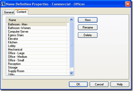 | Area Name Definition Properties - Content tab On the Content tab of the Area Name Definition Properties dialog box, you can use the New, Rename and Delete buttons to work with the Name list in the left pane. You can also right-click on your mouse to invoke a Context menu with the same three options( except "New" is labeled as "Insert"). The sorting is always Alphanumeric. Illustrated to the right, I show an example of some Area Names you might use for a Commercial job. Keep in mind that these are just names for Area Objects and have no greater purpose than helping you organize by some form of Name. You can organize with Area Styles and Area Groups in far more powerful ways. These Names can be used in Schedules and corresponding Area Tags. They can also be used in Area Evaluations when breaking Area Groups down to individual spaces.