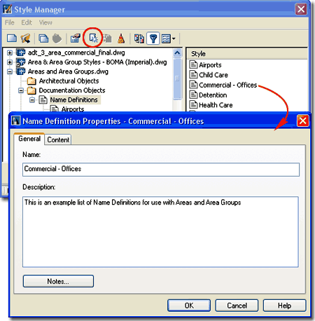 under In the illustration to the left I show how the you can use the the Default Standard Area Name Definition as long as you are also using the default Area Group or no Group at all. Illustrated to the right, I show the process of creating a custom Area Name Definition Style that I have named "Commercial - Offices". On the General tab of the Name Definition Properties dialog you will find a very short list of options because this Style is just a list of names. |