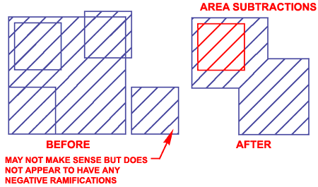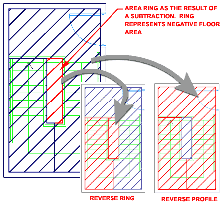 Subtracting Area Objects is much like Subtracting Spaces and other objects in ADT. It is based on the Boolean "Subtract" operator often applied in Solid Modeling. When you Subtract, you must first the select the Area Object you wish to keep and then the Area Object(s) you wish to subtract from the first object. Be aware that you can subtract non-overlapping objects; the result is that one object usually disappears. When an Area Object is subtracted from a boundary completely inside another Area Object, the result is a Ring of negative Area that you can use other tool on to Reverse or Remove - see comments on Area Rings below. This Negative Area has its own Display Representation. |