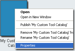 Properties A Catalog in the Content Browser is something similar to a Folder but when you look for it with Windows Explorer, you will find it listed as a unique file type with the three letter extension of ".atc." (autodesk tool catalog or something to that effect). This "catalog" has a unique set of Properties as illustrated to the right and serves as the primary container of Categories, Packages, Palettes and Tools (see discussion below).