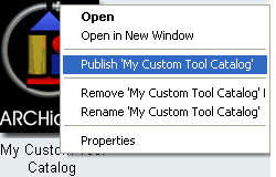 Organizational Objects Within a custom Catalog in the Content Browser you will find three organizational Objects that you can use to organize Tools: Categories, Packages and Palettes. If you don't want to use any of these Objects, you can drag-n-drop Tools directly to the Catalog's Cover Page. Category - use this "Object" to create something analogous to a page ( or sub-folder) with the option to use any of the three organizational Objects found on the Catalog Cover Page. You can see an example of this in many of the default Catalogs that come with ADT and it is useful for large Catalogs. Package - use this "Object" to store a collection of Tools that you may wish to drag directly to any existing Palettes you may have. In other words, it is a package ( or collection) of Tools for quick transfer. Only Tools can be added to a Package. Palette - use this "Object" to create an actual Palette Object that can be added to your current Tool Palette. Only Tools can be added to a Palette. When Palettes are added to the current Tool Palette, a new file is created - see comments under "Note" below. Regardless of how any Tool has been organized, you can always access a single Tool and drag it directly to any current Tool Palette. Note: |