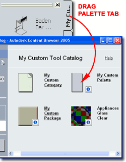 Illustrated to the right I show some of the drag-n-drop options you have for copying Tools to and from the a Catalog in the Content Browser. By using the Context menu option for "Open in New Window" you can activate multiple Catalogs, Categories, Packages or Palettes to copy Packages, Palettes or individual Tools. Not that I feel completely comfortable about advising it, I did find that this is even possible between different versions of ADT. One of my favorite drag-n-drop actions is to take a Tool from a Catalog directly to the current drawing environment. This is particularly useful with Tools that you don't use regularly.