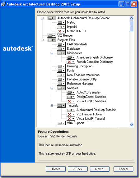 Typically I recommend that users install based on the Full or Custom options but now ADT only offers "Standard" or "Custom". The only problem with choosing "Custom" is that inexperienced users may inadvertently omit important components but then you could always turn "Custom" into "Full" by selecting all components. Metric users will most likely want to use the Custom option so they can install both the Metric and D A CH Content at the same time rather than return to Add it later. Some of the key items that can be installed or left out are Metric Content, Tutorials/Samples and Viz Render. Even if you are not a Metric user, I do recommend installing this content because there are many Metric Multi-View Blocks that are quite useful to Imperial Units users ( outdoor furniture, for example ). Viz Render (now in version 2) is a "dumbed-down" or light version of Autodesk Viz and has been included to help ADT users take advantage of ADT's new Material Styles. Autodesk Viz was slated to be discontinued but apparently the user-base uproar forced a snappy return to market with only a six-month nap. For many, including me, Viz ( the full package ) is far more pleasant to work with because you can actually create in it as opposed to Viz Render where you can only make Materials and Render. and it is unclear what, if anything, will replace it. Because of the Material correlation between Viz Render and ADT, you should definitely install this option. |