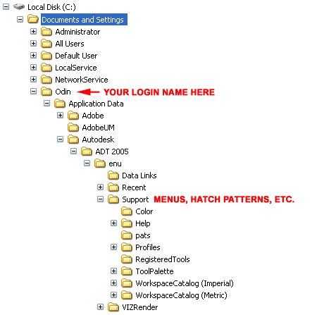 did all of my stuff go? Autodesk® AutoCAD® 2005 and Autodesk® Architectural Desktop 2005 (referred to in this guide as ADT 5 or ADT 2005) now meet Microsoft® Compliance and Certification requirements for Windows® 2000 and XP operating systems. What this means to previous users of AutoCAD and Architectural Desktop is that software data is no longer stored in one convenient folder but spread out a bit. You will still find the primary application data under Program Files\Autodesk Architectural Desktop 2005 but for a lot of the items that are likely to be unique between users, you will find them under the Documents and Settings folder as illustrated to the right. The primary reason I have decided to comment on this spaghetti nest of folders is that you may need to do some GUI and file location adjustments to ADT 5 in order to feel more comfortable with this upgrade. The menu files that you may want to work with, for example, are now stored under Documents and Settings\ [YourLoginName] \Application Data\Autodesk\ADT 2005\enu\Support. If you do not find the items you are looking for under this path, your IT Manager may have set your system up for "roaming" accounts and thus this information resides somewhere on an office Server ( don't ask me where, it's different for every office ).