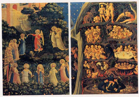 This is a closeup of the "Last Judgment" by Beato Angelico. There's quite a difference between what's happening in the right and left sides of the picture.