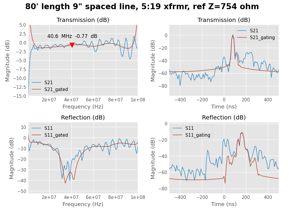 Even with these measurement imperfections, quite low attenuation for this length of line is reported. This low transmission attenuation exceeds the specifications for even the reasonably high performance LMR240 coaxial test cables being used as part of the overall test fixture. Manufacturer’s specification for this cable would indicate a corresponding loss at 40 MHz of around 1.2 dB for the same physical length.