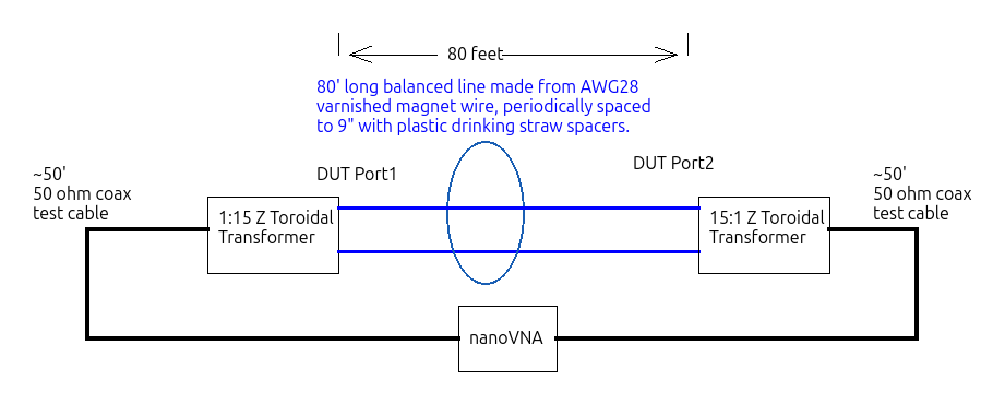 This experiment is a measurement of an 80 foot length of 2-conductors of AWG #28 magnet wire separated by 9” drinking straw spacers as depicted in Figure 1. Some extra detail of this simple measurement is provided in order to describe the environment and analyses common among many of the following experiments.