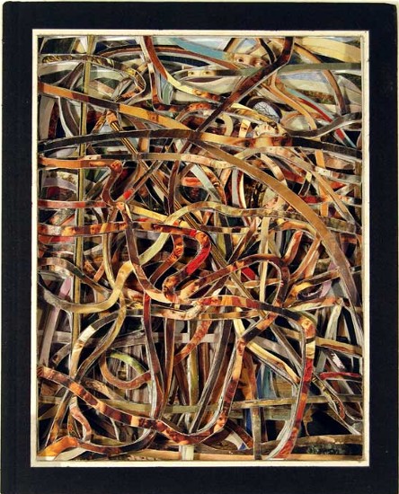 $3,400 Dettmer's works generally involve found books that are then altered in various ways. In this work, he began with a book about 19th Century art and selectively cut away through each page leaving a pattern of chosen images. In the detail, you can see that most of the remaining swirls contain the eyes of the portraits he "exposed".