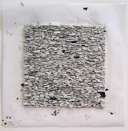 Leonardo Drew "143T", 2007 Mixed media on paper 23 x 23 inches $12,000 framedThe artist makes collages using various materials that he breaks into pieces or wads together and then assembles them into these larger grids. This work involves shards of acrylic paint that he first pours into thick sheets and allows to dry. The paint is then frozen to make it brittle and cut. The pieces are then stacked to make the final works. Other materials he has used are densly compressed cubes of cotton and bits of rust shards.