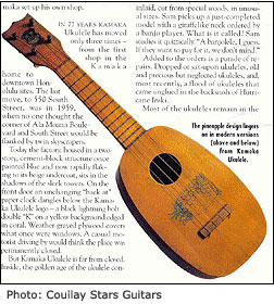 ![]() Phileas Fogg Award for Best Capturing the Spirit of Hawaii Jumping Fleas Islands Sam Kamaka is showing me the original pineapple ukulele. Its oval shaped, not the usual nipped-in-the-middle model. His father, Samuel K. Kamaka, designed this one around 1916, he tells me, and when it was finished, a neighbor with an artistic bent exclaimed, It looks like a pineapple! Sam turns the pegs so the strings on the original pineapple are tuned to My dog has fleas. I ask for a song, mentally settling back for a rendition of Aloha Oe. Instead, Little Brown Jug comes as a bit of a jolt...... |