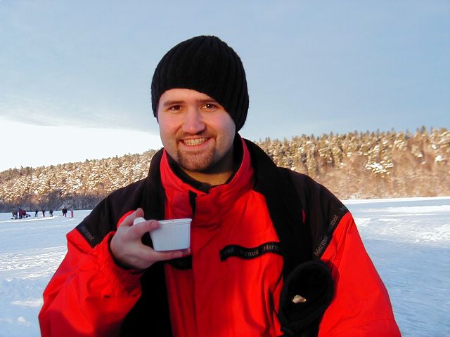 Sweden Pictures -- Eric enjoys some Glugg (hot wine mulled with spices) after skating.