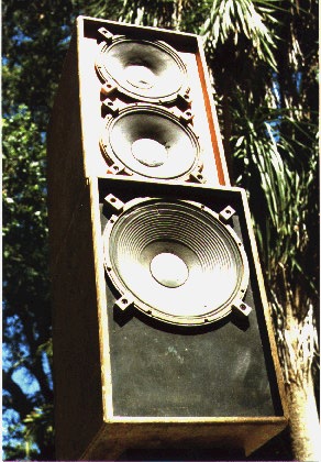 #00002 Small Wall... Grateful Dead speaker cabinets, circa 1974. The 15" is one of Phil Lesh's 36 bass speaker cabinets (serial # 86 on back) from his two thirty foot high stacks. Built by Appleby in Sebastopol as part of the traveling "wall of sound" during the mid seventies it saw hard use, and is beat to hell. Authenticated.