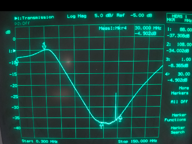 Another problem on the hilltop is that of very strong FM broadcast signals. At the 2m dipole signal voltages exceed .5 Volt peak-peak. Since the input of the OpAmp is very high impedance, there is no easy way to filter these signals and protect the active stages from generating IMD. At the output of the first preamp, however, there is some filtering which helps protect downstream stages. Here is the swept response of a unity-gain preamplifier driving 60 feet of CAT5 cable which is received by a second differential amplifier at the Kiwi: