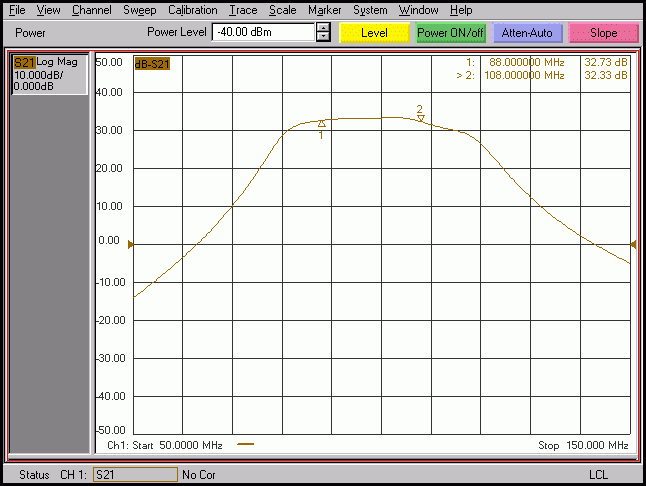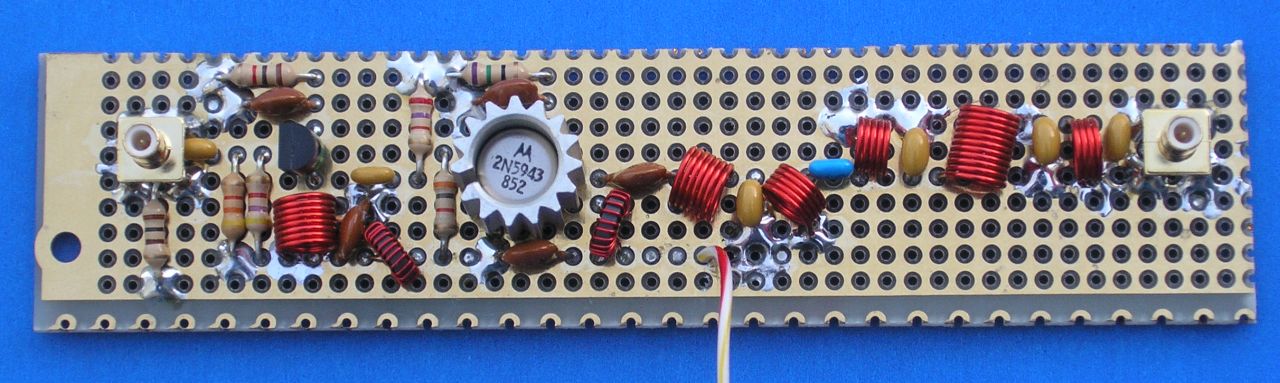 A network analyzer shows exactly what’s going on in an RF circuit and with a little tweaking of the components the hand wired amplifier is flat and has lots of gain. The filter on the output has a good flat band pass and good harmonic rejection. These plots were made with the better MRF515 output stage.
