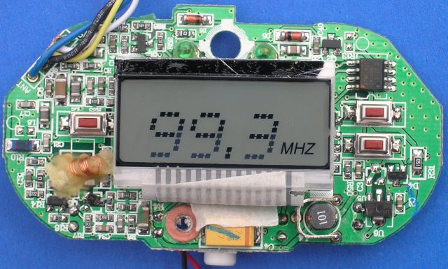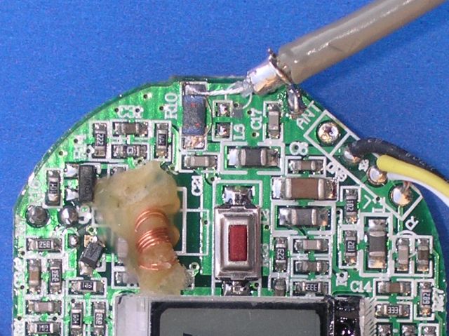 This image shows the blue wire cut, the blue inductor at the top shorted, and where the coax is attached. When the unit is assembled, the coax can be routed out the hole where the audio cable is stored. The measured signal level is -22dbm at 107.9 MHz and -15dbm at 88.1 MHz. That's not much power if you need it to go very far. Shorting the inductor as shown increases it to about -12dbm across the band, a little less than 1/10 of a milliwatt and you don't need it when driving 50 ohms. The coax can then be used to drive an external RF amp described here. It'll take allot of gain (at least 20db gain) to get any good range, but it's a nice stable stereo signal, and this amp will do the trick.