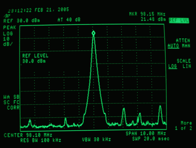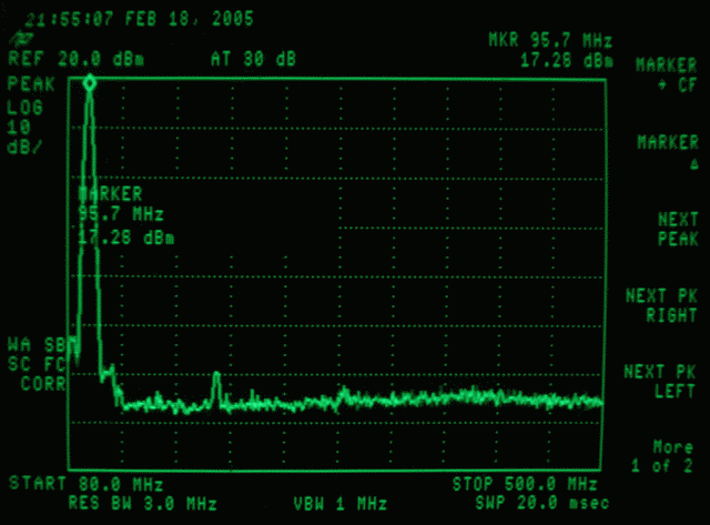 The second plot shows harmonics to be well suppressed by the filtering. Spurs seen in the third plot are present in the original un-amplified output and are probably generated by digital circuits in the BH1415 chip but are low enough not to cause any harmful interference aside from the main signal itself, and are amplified along with it. The marker reads 21.48dbm output power at the center frequency and it's good and strong in the kitchen. If there were going to be a $10,000 dollar fine or 6 months in jail, this would be the reason. Best just to stay with the original un-modified version.
