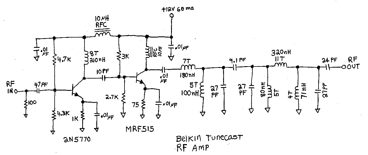 Here is an easy to build hand wired prototype RF amp that has up to 32 db of gain and is constructed on a piece of circuit board with ground plane on one side. The transistors are 2N5770 (similar to NTE108) and MRF515. These are listed on RF Parts http://www.rfparts.com/mototran.html#MRF502 for 2.95 each. The coils are made with #24 wire wound around a 3/16-inch diameter screwdriver blade. This photo shows a 2N5943 (similar to NTE77) in place of the MRF515 which has 2db less gain and 2db less max power output but still plenty of signal for around the house and it is more plentiful. The amplifier operates on 12 volts DC at 60 milliamps.