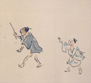 | At right is Yosa Buson's 1779 depiction of the scene. Click here for full image (625 x 240, 78k). Click here to go to the original Japanese web page. This portion of Ilustrated Scroll of Narrow Road to the Interior 奥の細道画巻 is housed at the Kyoto National Museum 京都国立博物館. | |||||||